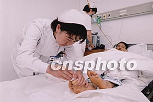 在阿富汗恐怖襲擊事件中受傷回國治療的四名中國工人住進山東省立醫(yī)院后,受到了醫(yī)護人員無微不至的關懷。圖為山東省立醫(yī)院護士在為傷員席守忠修剪腳趾甲。中新社記者:張偉