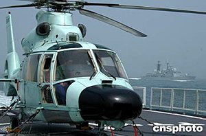 北海艦隊“哈爾濱”號導彈驅逐艦、“洪澤湖”號綜合補給艦、“海豚”艦載直升機和英國皇家海軍“?巳亍碧枌楎屩鹋、“山貓”艦載直升機參加此次非傳統(tǒng)安全領域的聯(lián)合演習。