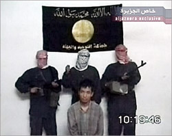 20日晚,阿拉伯“半島”電視臺(tái)播放了一段錄影帶,畫面上的武裝份子稱,除非韓國(guó)保證在24小時(shí)內(nèi)停止派兵赴伊拉克,否則他們將把一名韓國(guó)人質(zhì)斬首。綁架人質(zhì)的武裝分子自稱屬于“團(tuán)結(jié)圣戰(zhàn)組織”。該組織曾多次通過電子郵件向半島電視臺(tái)發(fā)送綁架人質(zhì)的錄像片段,或在其網(wǎng)站上聲稱對(duì)某一襲擊事件負(fù)責(zé)。據(jù)稱,該組織由恐怖頭目扎卡維領(lǐng)導(dǎo),與“基地”組織有聯(lián)系。