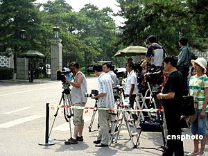 在成群的記者隊(duì)伍旁邊,還另有一道風(fēng)景線。比起略顯緊張的記者群,一旁的這群人則顯得相對安逸。其中,一位六十三歲的老者告訴記者,他住在附近,第一次六方會(huì)談他就過來看了,這次也過來“關(guān)心一下國家大事”。一旁還有兩位學(xué)生模樣的人,詢問后得知,一個(gè)是清華大學(xué)的學(xué)生,一個(gè)是北京交通大學(xué)的學(xué)生,適逢考試結(jié)束,這兩位高中時(shí)代的同學(xué)今天結(jié)伴,到這里“開開眼界”。