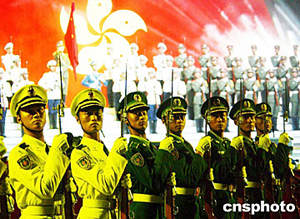 為慶祝香港回歸祖國(guó)七周年,中國(guó)人民解放軍四百人組成的藝術(shù)團(tuán)六月二十三日在香港紅磡體育館舉行首場(chǎng)盛大演出。圖為駐港部隊(duì)三軍儀仗隊(duì)參加演出。中新社記者:錢興強(qiáng)