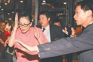 王菲和其助理、孫楠、李亞鵬乘林肯車回酒店,計(jì)劃由孫楠充當(dāng)攝影記者的擋箭牌,分散注意力,保護(hù)二位順利上樓?墒且饬现獾氖,在酒店門外,十多位王菲的歌迷,苦等了一夜,依舊站在那里不停地呼喊,氣勢不減;還有,記者的兩臺車始終分隔在林肯轎車的前后,原本要躲避影迷從酒店員工通道進(jìn)入的林肯轎車不得不兜了一大圈后,停靠在酒店正門。歌迷瘋狂到了極點(diǎn),孫楠根本無法引開火力,緊要關(guān)頭,一向低調(diào)的王菲親自掩護(hù)起李亞鵬來。