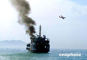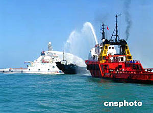 今天參加聯(lián)合搜救演習(xí)的船只共有二十九艘、另有香港飛行服務(wù)隊(duì)兩架飛機(jī)參加行動。按照演習(xí)預(yù)定的項(xiàng)目,假設(shè)在南海某一海域發(fā)生船舶爆炸起火事故,十二名船員棄船逃生,船上有燃油溢出污染海面;另一艘船舶沉沒,十余名船員落水。海南省海上搜救中心接到報告后,立即啟動應(yīng)急搜救程序,隨即展開了一場海陸空全方位的海上搜尋救助、海上消防滅火和海上溢油應(yīng)急行動。結(jié)果成功營救了所有落水船員,并對遇險船只進(jìn)行了消防、對海面進(jìn)行了清理污染的行動。