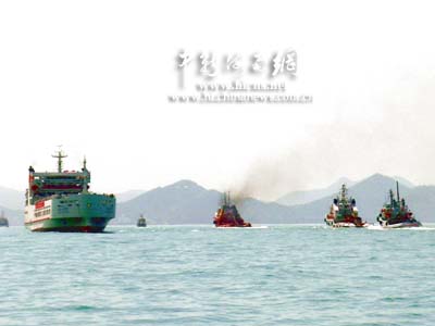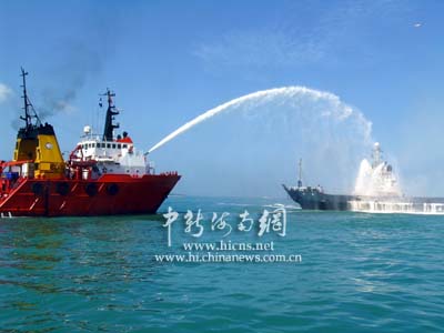此時,觀摩演習(xí)的人們發(fā)現(xiàn),在出事船只周圍,已經(jīng)有多條各類救助船開始行動,中國救助船“南鷹”輪和“南海救一六八”輪一左一右向燃燒著的遇難船只進行壓制性滅火。兩只泡沫槍和一只高壓水槍對準海難船強制滅火。此時的場面蔚為壯觀,一只高壓水槍激起的水霧在熱帶陽光的照耀下出現(xiàn)了一道漂亮的彩虹。