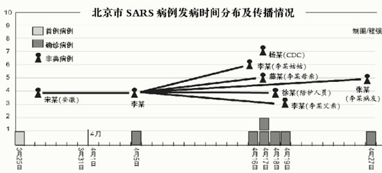 賀雄說(shuō),根據(jù)流行病學(xué)調(diào)查,可以判定,北京市發(fā)現(xiàn)的首例病例李某的傳染源為安徽非典患者宋某,隨后,李某又感染了自己的親屬和同病室病友,這個(gè)傳播鏈基本確定,即“首發(fā)病例宋某—李某—李某家庭及醫(yī)院傳播”。