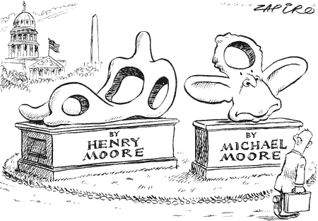 中新網(wǎng)7月5日電 約翰內(nèi)斯堡媒體Mail & Guardian近日刊登了這副漫畫,向讀者展示了兩件藝術(shù)作品:一個(gè)是邁克爾·摩爾的電影《華氏911》,一個(gè)是雕塑家亨利·摩爾的雕塑作品《沉睡中的女人》。