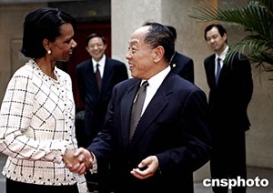 七月八日,中國(guó)外交部部長(zhǎng)李肇星與剛剛抵達(dá)北京的美國(guó)總統(tǒng)國(guó)家安全事務(wù)助理康多莉扎·賴斯舉行會(huì)談。中新社記者:鄭萍萍