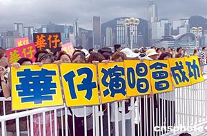 歌影紅星劉德華7月8日在香港尖沙咀星光大道舉行《道地百果園劉德華Vision Tour演唱會(huì)2004》記者會(huì),大批“華仔”歌迷帶備標(biāo)語到場支持,為偶像打氣。作者:鄧慶樂