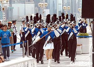 步操團(tuán)奏樂表演為記者會(huì)助聲勢。歌影紅星劉德華7月8日在香港尖沙咀星光大道舉行《道地百果園劉德華Vision Tour演唱會(huì)2004》記者會(huì),大會(huì)特意安排步操團(tuán)奏樂表演,為記者會(huì)助聲勢。作者:鄧慶樂