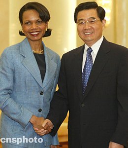 中新社北京七月九日電(記者齊彬)中國國家主席胡錦濤今天在會見到訪的美國總統(tǒng)國家安全事務(wù)助理賴斯時(shí)表示,希望美方恪守承諾,尤其要將承諾轉(zhuǎn)化為實(shí)實(shí)在在的行動,不要向臺灣當(dāng)局發(fā)出錯誤信號,以免損害臺海地區(qū)的和平與穩(wěn)定。