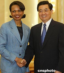 中國(guó)國(guó)家主席胡錦濤,七月九日在北京會(huì)見(jiàn)美國(guó)總統(tǒng)國(guó)家安全事務(wù)助理康多莉扎·賴斯。中新社記者:鄭萍萍