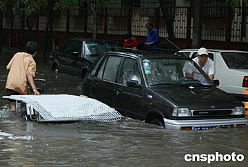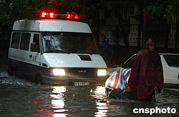 10日下午4時許,北京上空電閃雷鳴,突遭瓢潑大雨,北京城區(qū)部分街道水深及膝蓋,部分車輛因發(fā)動機進水而癱瘓于路中,城區(qū)交通嚴重擁堵。