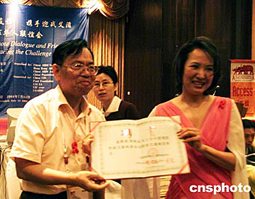 著名的美籍華人歌唱家鄭緒嵐七月十四日在泰國(guó)曼谷召開(kāi)的世界艾滋病全球華人聯(lián)誼會(huì)上被聘為中國(guó)預(yù)防艾滋病宣傳員,中國(guó)預(yù)防性病艾滋病基金會(huì)會(huì)長(zhǎng)曾毅院士向她頒發(fā)了聘書(shū)。這次主題為“交流、合作、聯(lián)誼,攜手迎戰(zhàn)艾滋”的聯(lián)誼會(huì)是由中國(guó)預(yù)防性病艾滋病基金會(huì)、香港艾滋病基金會(huì)、中國(guó)人口宣教中心等四家機(jī)構(gòu)共同主辦的。中新社記者:曾利明