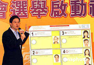 政務(wù)司司長曾蔭權(quán)(右二) 、政制事務(wù)局局長林瑞麟(右一) 、民政事務(wù)局局長何志平(左二) 、選舉管理委員會主席胡國興大法官(中) 主持立法會選舉開幕典禮并為選票加蓋印。