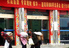 據(jù)最新統(tǒng)計數(shù)據(jù)顯示:截至二○○四年七月二十日,中國內(nèi)地證券投資基金的凈值已經(jīng)達到三千零一點九二億元,約占A股流通市值的四分之一。而在二○○三年九月,基金凈值占兩市A股流通總市值的比例只有百分之十三點五。圖為七月,云南香格里拉的幾位居民經(jīng)過一家懸掛著基金銷售橫幅的銀行。中新社記者:武仲林