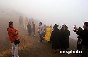中國(guó)吉林長(zhǎng)白山天池怪獸被之迷被傳媒稱(chēng)為“世界四大未解之謎”(水怪之謎、野人之謎、百慕大三角之謎、飛碟之謎)之一。二○○四年七月中旬,成百上千的國(guó)內(nèi)外游客,冒著雨水和大霧登上海拔二千多米的天池火山口,期盼清日之中目睹長(zhǎng)白山天池的真容和怪獸的蹤跡。天池是火山噴發(fā)自然形成的火山口湖,是中朝兩國(guó)的界湖。因?yàn)樗幍奈恢酶?水面海拔2194米),所以稱(chēng)為“天池”。中新社記者:鄒憲
