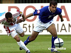 二○○四年七月二十三日,亞洲杯B組比賽在濟(jì)南山東省體育中心重燃戰(zhàn)火,由業(yè)余球員組成的約旦隊迎戰(zhàn)目前小組排名第一的科威特隊。中新社記者:武仲林