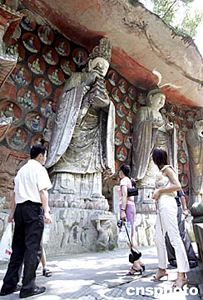 二○○四年七月下旬,游客在世界著名文化遺產(chǎn)重慶大足石刻參觀華嚴(yán)三圣中的文殊菩薩(左)和大日如來像。文殊菩薩手托重達(dá)千斤寶塔,歷時八百余年而不墜,體現(xiàn)了中國古代工匠對力學(xué)的精巧應(yīng)用。中新社記者:毛建軍