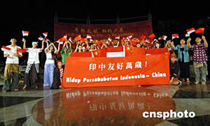 一百多名來自美國、英國、委內(nèi)瑞拉、巴西、馬來西亞、印尼、緬甸等七個(gè)國家和香港、澳門特別行政區(qū)的華裔青年,二十五日晚在廣州華南師大與廣州青年歡聚一堂。印尼華裔青年在聯(lián)歡會(huì)上表演節(jié)目。作者:羅仰明