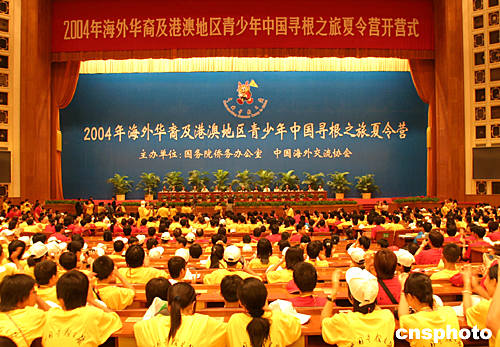 “2004年海外華裔及港澳地區(qū)青少年中國(guó)尋根之旅夏令營(yíng)”開(kāi)營(yíng)儀式二十七日在北京人民大會(huì)堂舉行,此次由國(guó)務(wù)院僑辦和中國(guó)海外交流協(xié)會(huì)主辦的夏令營(yíng)共有三十六個(gè)國(guó)家和港澳地區(qū)的近四千名青少年參加。中新社記者:史利