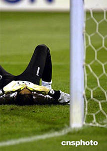 7月27日晚,亞洲杯B組科威特隊(duì)、韓國(guó)隊(duì)生死爭(zhēng)奪戰(zhàn)在濟(jì)南山東省體育中心舉行,最終科威特以0比4負(fù)于韓國(guó)隊(duì),無(wú)緣八強(qiáng)。圖為四度被洞穿球門的科威特門將懊惱不已。中新社記者:武仲林