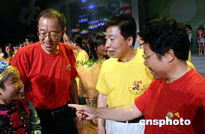 七月二十九日晚,中國(guó)首飛太空航天員楊利偉(右二)在北京奧林匹克體育館出席了《中國(guó)尋根之旅夏令營(yíng)》聯(lián)歡晚會(huì),與會(huì)的中外青少年與他們心目中的英雄零距離接觸感到十分高興。中新社記者:史利
