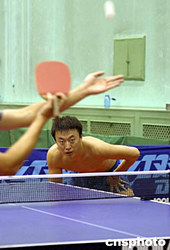 七月三十日,中國國家乒乓球隊主力隊員馬琳正在河北正定乒乓球訓練基地赤膊上陣,刻苦訓練。中新社記者:張勤