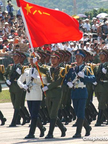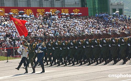 8月1日,香港回歸七年來(lái),駐港部隊(duì)今天首次公開(kāi)閱兵,包括政府高官、社會(huì)名流和眾多第二屆立法會(huì)議員在內(nèi)的逾一萬(wàn)五千名香港市民,在新界石崗軍營(yíng)親睹了陸?杖娪馊Ч俦鴧⒓拥年(duì)列操演。