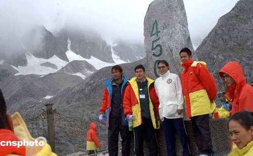 8月1日,香港愉園足球隊的隊員在云南麗江瀏覽著名風景區(qū)玉龍雪山。2日愉園足球隊將在麗江與東巴足球隊進行比賽。作者:洪少葵