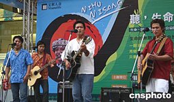 宏利人壽臺(tái)灣公司、臺(tái)北愛樂電臺(tái)等攜手制作出由花蓮縣“太平國小布農(nóng)兒童合唱團(tuán)”演唱的CD。CD義賣所得,將捐給臺(tái)癌癥希望協(xié)會(huì)。圖為四名原住民成人歌手,為推動(dòng)CD義賣在街頭落力演唱。中新社記者:董會(huì)峰