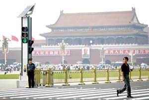 中新網(wǎng)8月2日電 據(jù)《京華時報》報道,昨天,北京市首個太陽能人行橫道交通信號燈在天安門廣場投入使用。據(jù)介紹,這也是建國以來天安門廣場首次安裝交通信號燈。此舉將大大降低游人橫穿馬路時的危險系數(shù)。