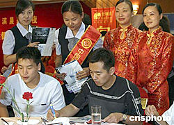 八月一日晚,秦皇島市人民政府,中信實(shí)業(yè)銀行,中國移動(dòng)通信集團(tuán)在海濱城市秦皇島為即將奔赴雅典的國家乒乓球隊(duì)領(lǐng)導(dǎo)和運(yùn)動(dòng)員舉行壯行酒會(huì)。中新社記者:張勤