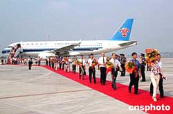 廣州新白云國(guó)際機(jī)場(chǎng)遷建落成慶典二○○四年八月二日在新機(jī)場(chǎng)停機(jī)坪舉行。一架空中客車在新機(jī)場(chǎng)降落并停在慶典會(huì)場(chǎng),一百二十名新機(jī)場(chǎng)的建設(shè)者手棒鮮花走下飛機(jī)走向會(huì)場(chǎng)參加落成慶典。作者:羅仰明