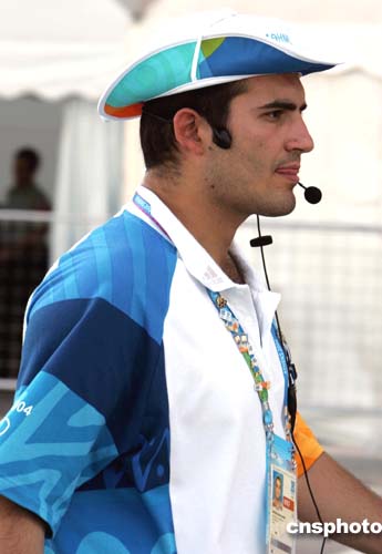 (當?shù)貢r間)二○○四年八月三日清晨,一名英俊的雅典奧運會男志愿者在記者新聞中心外調(diào)度穿梭巴士。中新社記者:任晨鳴
