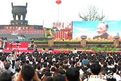 二○○四年八月三日下午,紀念鄧小平誕辰一百周年大型歌會在小平故鄉(xiāng)四川廣安舉行,宋祖英、張明敏、藏天朔、扮演鄧小平的演員盧奇等參加文藝表演。圖為大型歌會現(xiàn)場。作者:郭晉嘉