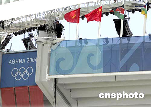 當(dāng)?shù)貢r間8月3日下午,雅典奧運(yùn)會開幕式依然在戒備森嚴(yán)的主體育場秘密演練,一名軍警在體育場最高處居高臨下監(jiān)視四下的一舉一動。中新社記者:任晨鳴