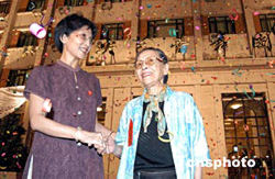 八月五日晚,中央芭蕾舞團大樓重新啟用“揭幕儀式”在北京舉行,由此拉開了紀念中央芭蕾舞團建團四十五周年系列活動的序幕。圖為中央芭蕾舞團團長趙汝蘅(左)與老一代中芭人戴愛蓮先生在揭幕儀式上。作者:徐曦弋