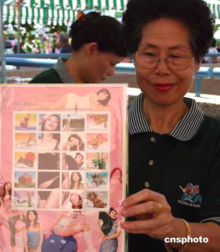 臺灣第一名模林志玲的個(gè)人化郵票八月六日亮相臺北郵展,二千五百張郵票很快銷售一空。圖為一名郵局工作人員展示林志玲個(gè)人郵票。中新社記者:董會峰