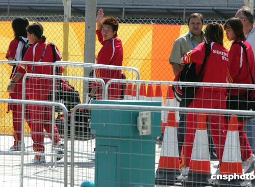 當(dāng)?shù)貢r(shí)間8月6日下午,參加雅典奧運(yùn)會(huì)的中國(guó)女足抵達(dá)雅典,隊(duì)員畢妍在嚴(yán)密的保衛(wèi)下向遠(yuǎn)在隔離線外的記者招手。中新社記者:任晨鳴