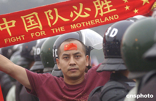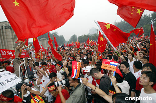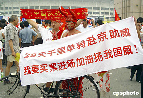 8月7日晚八時(shí),2004年亞洲杯足球賽決賽中國(guó)隊(duì)與日本隊(duì)的比賽將在北京工人體育場(chǎng)舉行,各地球迷提前到達(dá)北京工人體育場(chǎng)為中國(guó)隊(duì)加油。圖為北京工人體育場(chǎng)外為中國(guó)隊(duì)加油的球迷。