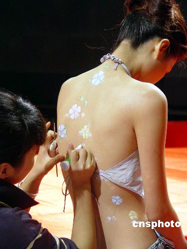 2004年8月7日,南京市某商家在其新產(chǎn)品推介會(huì)上,再次請來模特現(xiàn)場彩繪秀,以吸引消費(fèi)者眼球。作者:王耀武