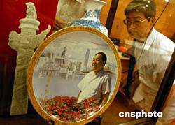 8月8日,由鄧小平夫人、88歲高齡的卓琳親筆題字“永遠(yuǎn)的懷念”的鄧小平紀(jì)念瓷,在剛開業(yè)的北京保利至尊寶禮畫廊首發(fā),紀(jì)念瓷限量發(fā)行2004套,每套四件,包括:“世紀(jì)偉人鄧小平”高檔新彩瓷盤像、“品德風(fēng)范萬年青”青花斗彩松鶴瓶、“東方風(fēng)來滿園春”彩繪花卉圓盤、“三陽開泰映神州”雙龍高溫顏色釉月光瓶。中新社記者:張宇
