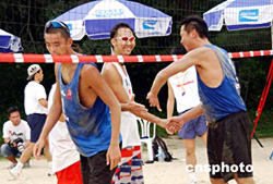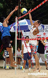由香港排球總會(huì)、康樂(lè)及文化事務(wù)署及Bolle合辦的“香港沙灘排球錦標(biāo)賽2004”于8月8日在黃金海岸舉行,進(jìn)入男子組總決賽的選手周?chē)?guó)偉、吳景鴻戰(zhàn)勝對(duì)手獲得冠軍。者:洪少葵