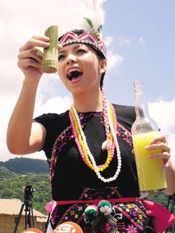 長(zhǎng)老送上原住民的“養(yǎng)樂(lè)多”給阿妹,阿妹盡情的飲用,阿妹同時(shí)要記者陪同喝一杯,因?yàn)榫湃帐前⒚玫纳,她希望記者分享她的喜悅,不要再去想那些煩人的政治議題。
