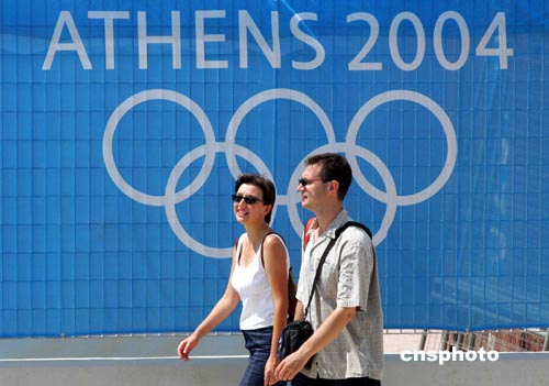 2004雅典奧運會開幕在即,雅典街頭的“奧運味道”也越來越濃。圖為一對青年男女經(jīng)過雅典奧運標志牌。中新社記者:張煒