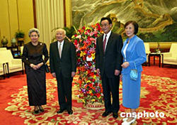 中新社北京八月九日電 (記者 朱大強)中國全國人大常委會委員長吳邦國今天在人民大會堂會見了柬埔寨國王諾羅敦·西哈努克和王后諾羅敦·莫尼列·西哈努克。賓主進行了親切友好的交談。