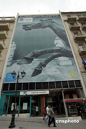 在希臘雅典市中心街頭,一幅數(shù)層樓高的宣傳畫以其獨(dú)具匠心的設(shè)計(jì)引人注目。中新社記者:王瑤