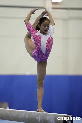 當(dāng)?shù)貢r(shí)間八月九日,中國(guó)女子體操隊(duì)隊(duì)員程菲在雅典奧運(yùn)會(huì)體操館進(jìn)行平衡木訓(xùn)練。中新社記者:毛建軍