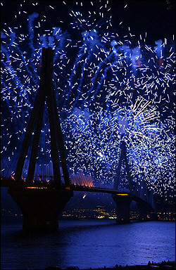 中新網(wǎng)8月11日電 據(jù)法新社消息,在雅典奧運(yùn)到來之前,雅典已經(jīng)開始著各項(xiàng)慶祝儀式。圖為雅典Rio-Antirio大橋上的煙花匯演。