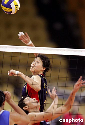 中國(guó)女排當(dāng)?shù)貢r(shí)間八月十一日下午在雅典奧運(yùn)排球比賽館進(jìn)行訓(xùn)練,并與希臘隊(duì)進(jìn)行熱身賽。主攻手趙蕊蕊傷愈復(fù)出后,精神狀態(tài)極佳,但仍舊受到腿傷困擾。中新社記者:毛建軍